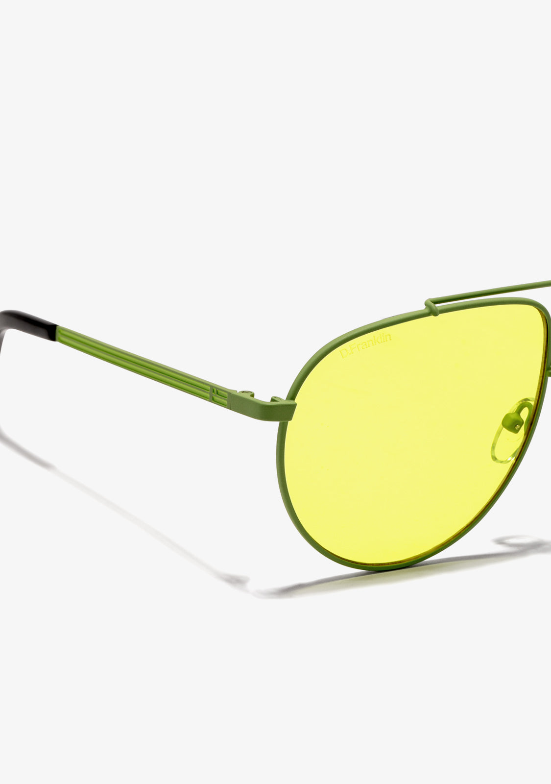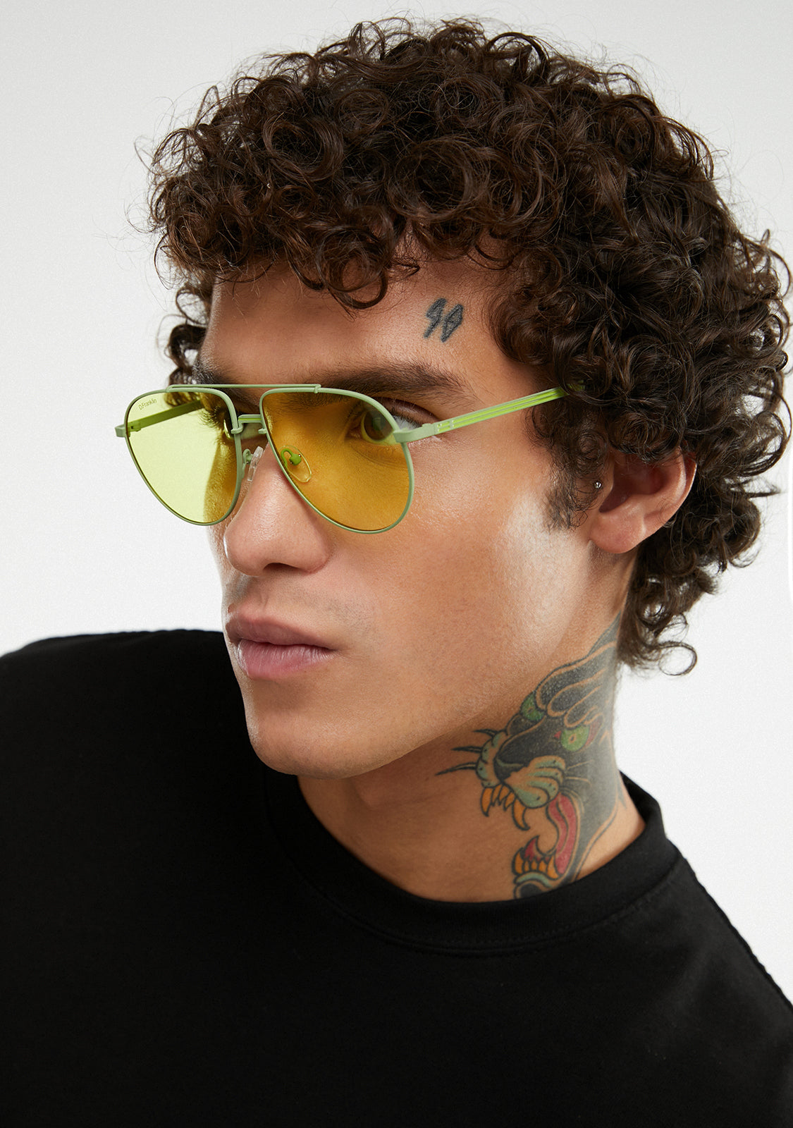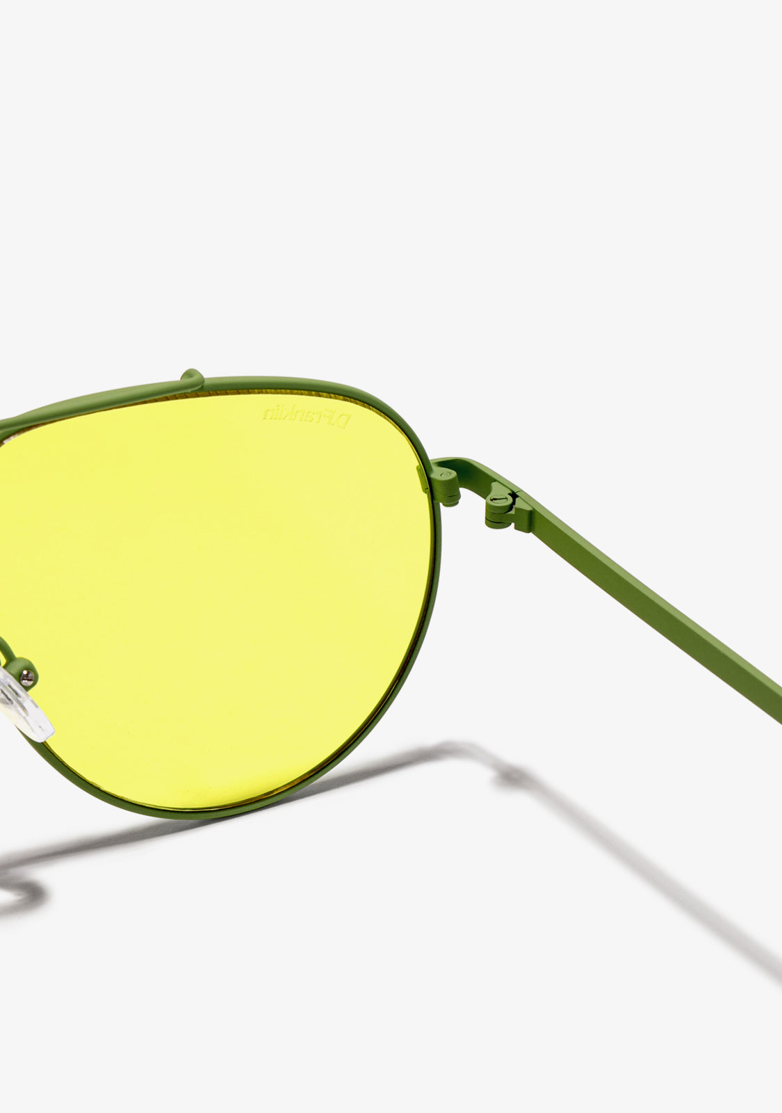 Yellow tinted smoked lenses and metallic green frame reinforce the unmistakable aesthetic. This model features our emblem on the right lens and logo on the side of the temples. It also has a 140 mm front frame and 60 mm lens width, which fits most faces. The temples are 140 mm long.In addition, this design has a Rim Lock system that allows the lenses to be replaced with prescription lenses. Ultraviolet protection UV 400 cat. 0.