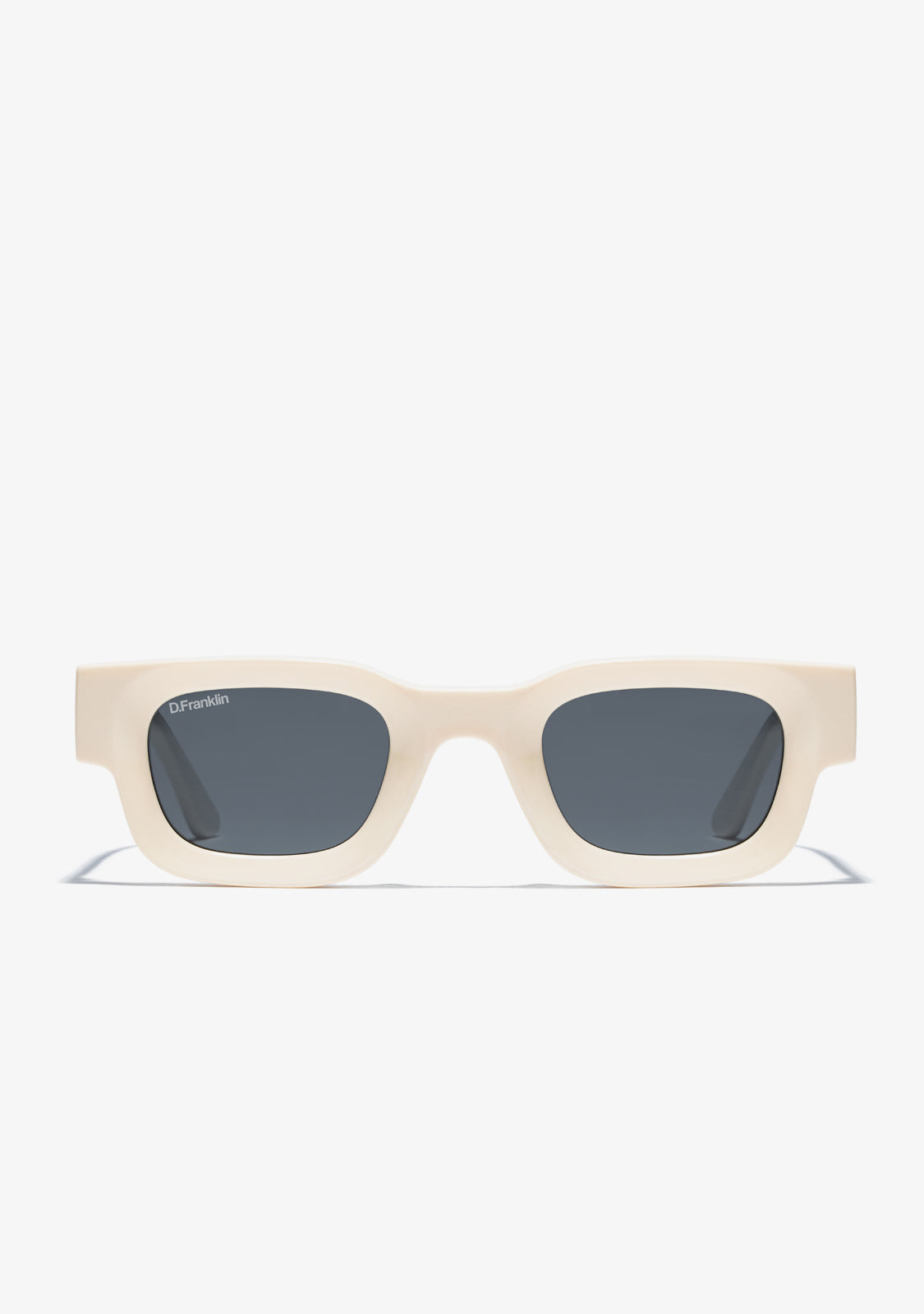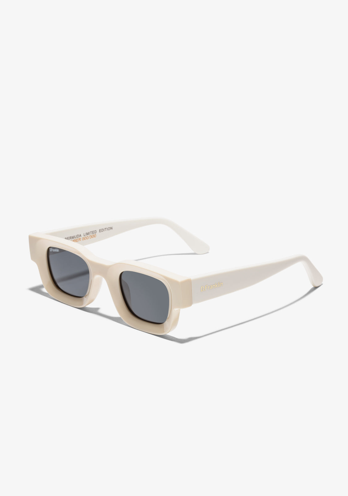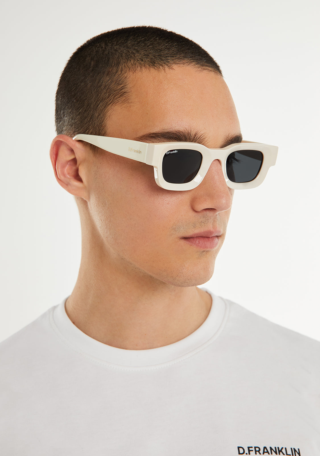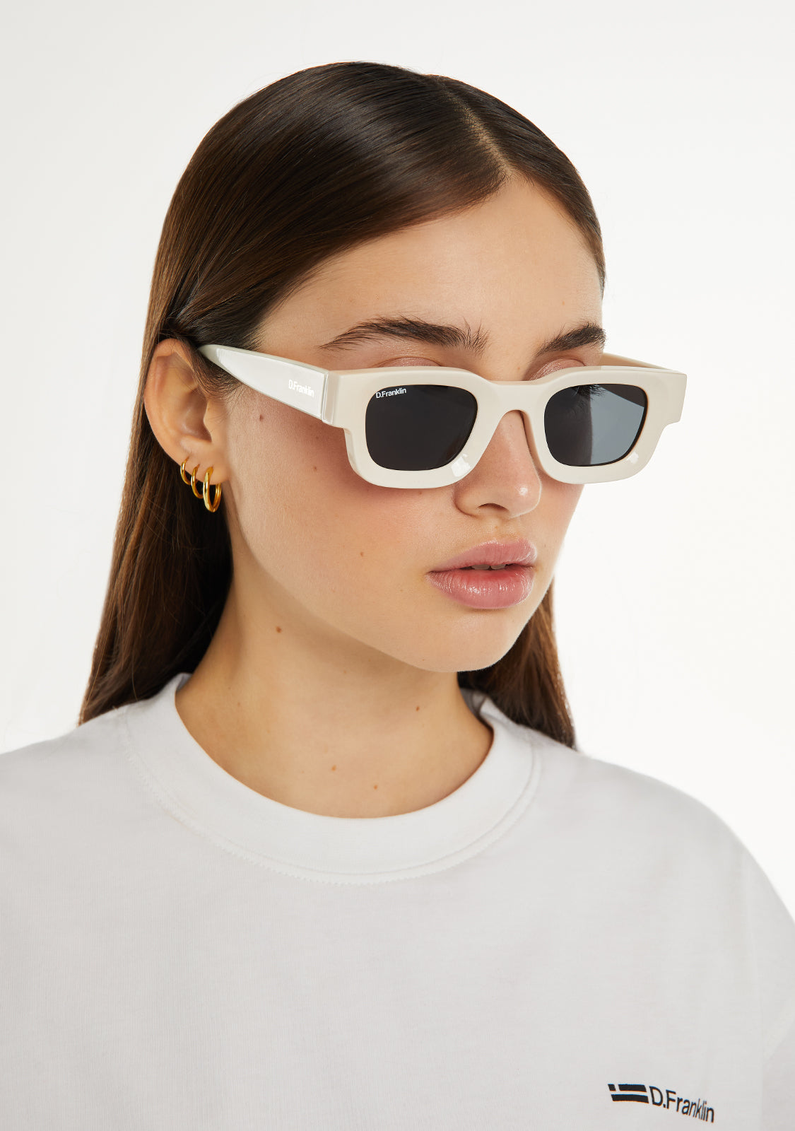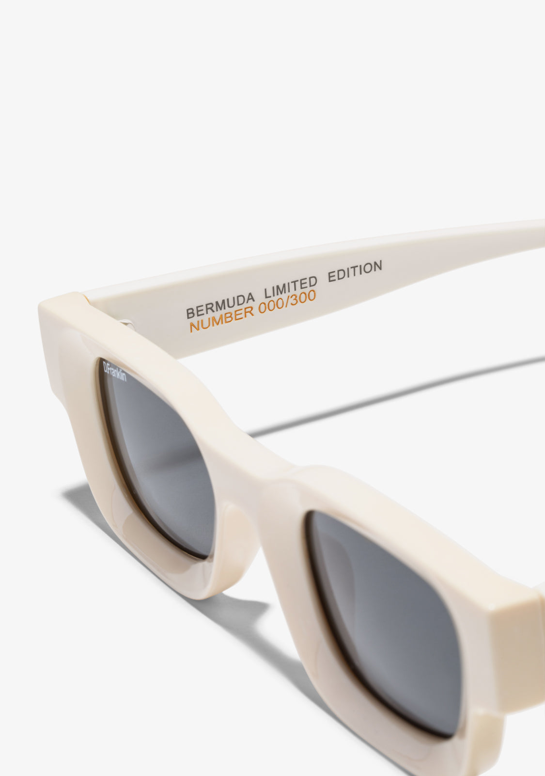 Bermuda White is a shiny finish design made from materials inspired by quartz. Thick frames and smoked lenses represent our different prisms, framed in an oversized rectangular silhouette specially designed to interact with new spaces.