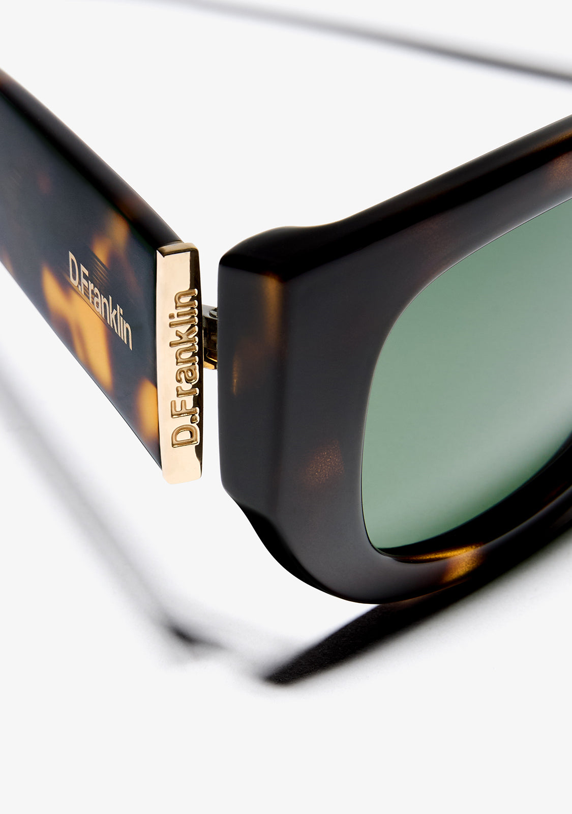 The Blaze Tort / G15 sunglasses feature a bold rectangular silhouette with a sleek tortoiseshell frame and green lenses. Inspired by retro shapes and refined with clean lines, they add a confident edge to everyday looks.