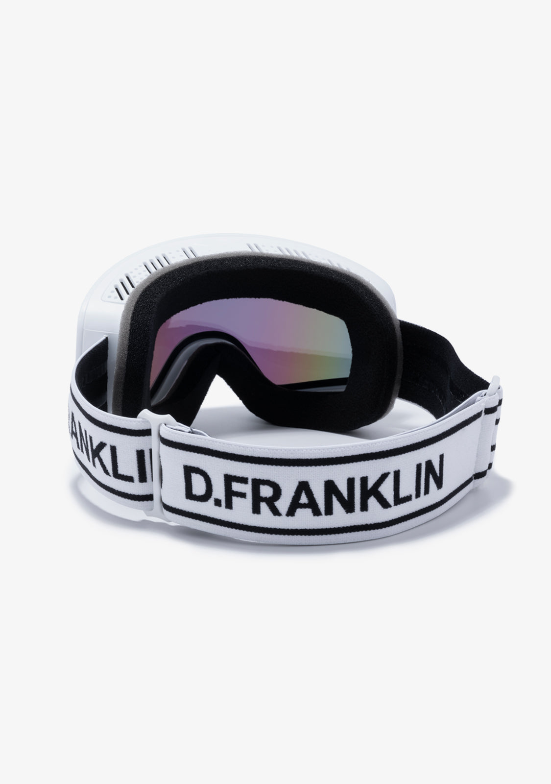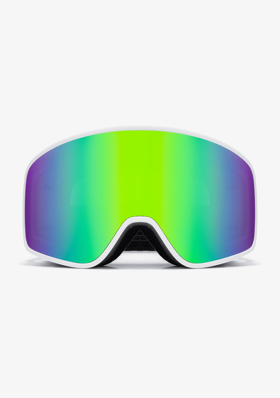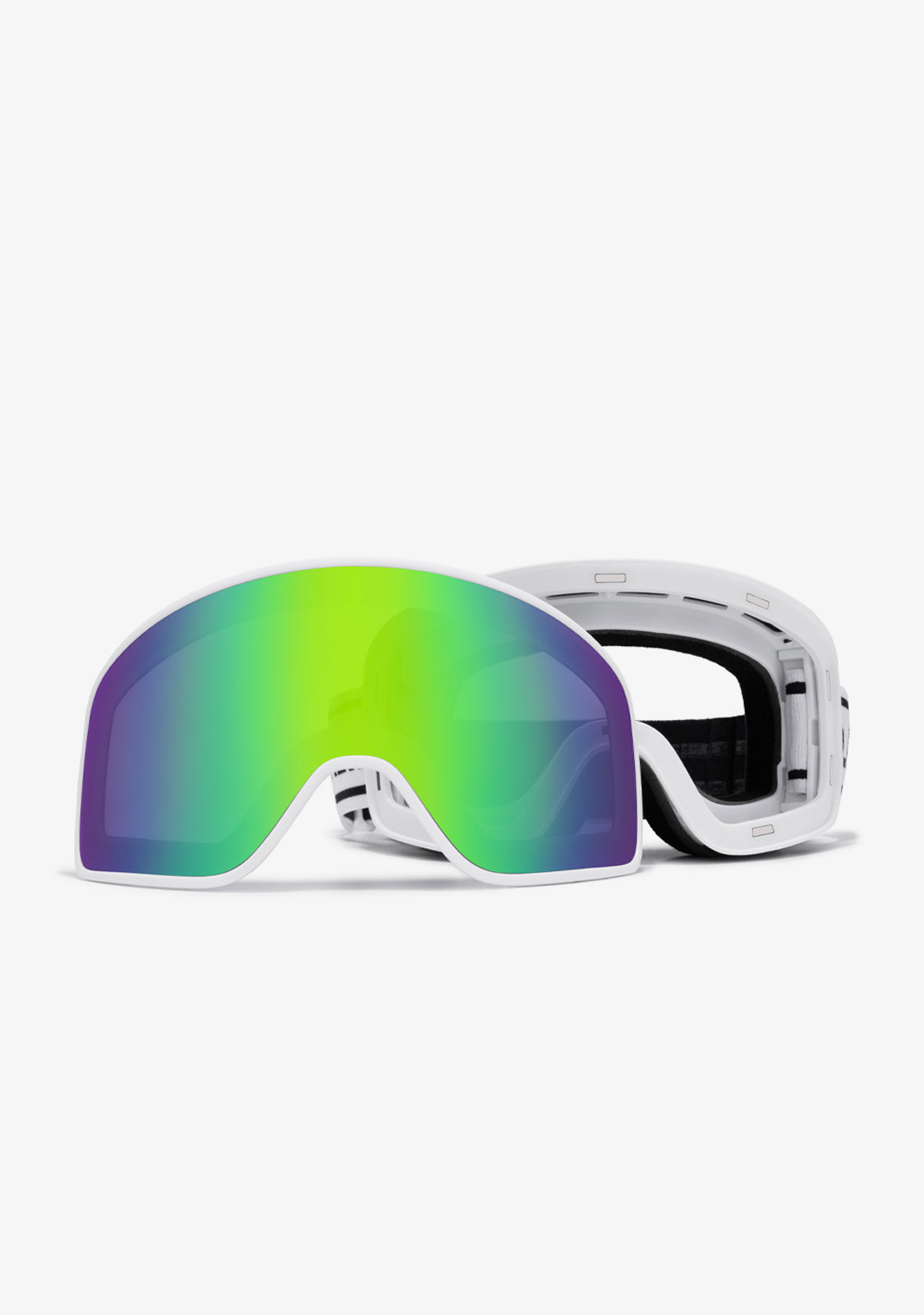 This peak-inspired model features a mirrored polycarbonate lens with no limits or frame. It features a green and white finish with our signature emblem on the side of its white elastic band. Uniform lens width is 179.5 mm.