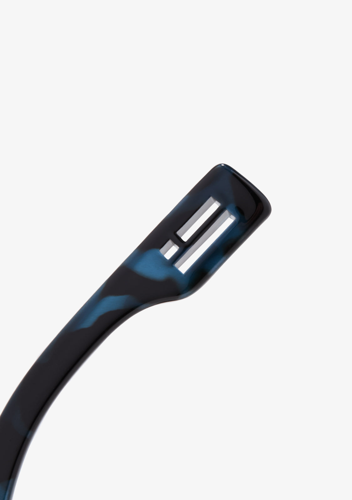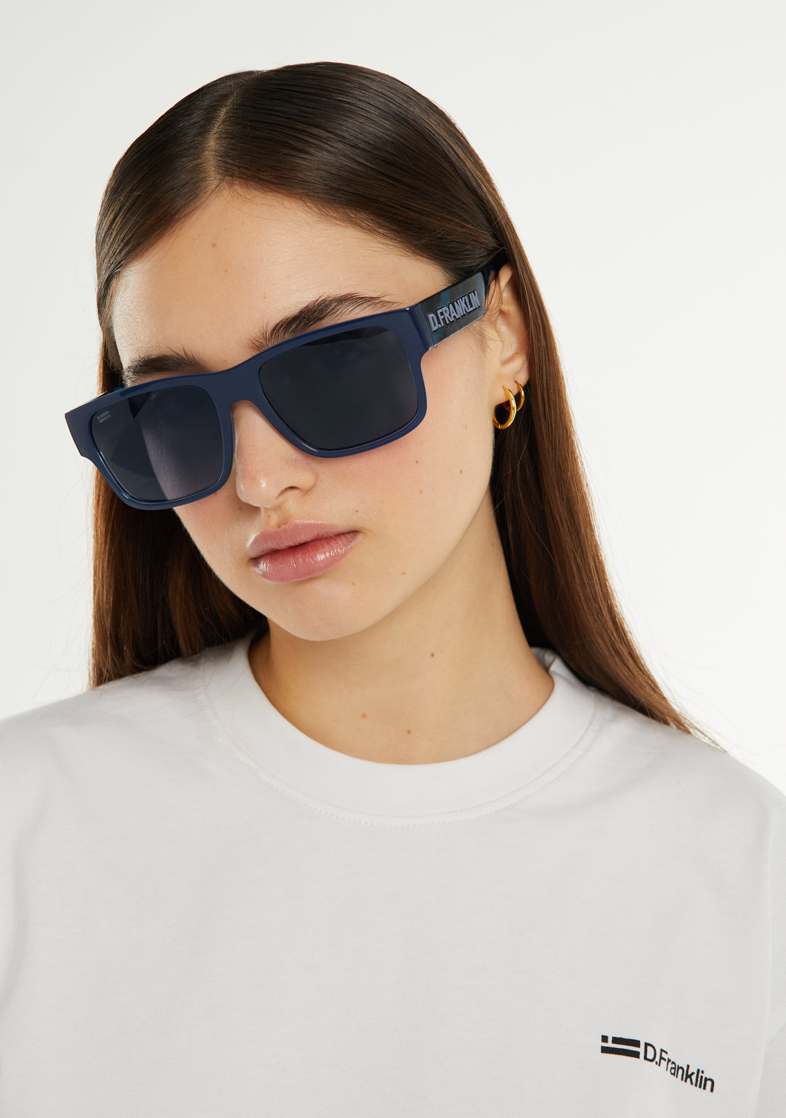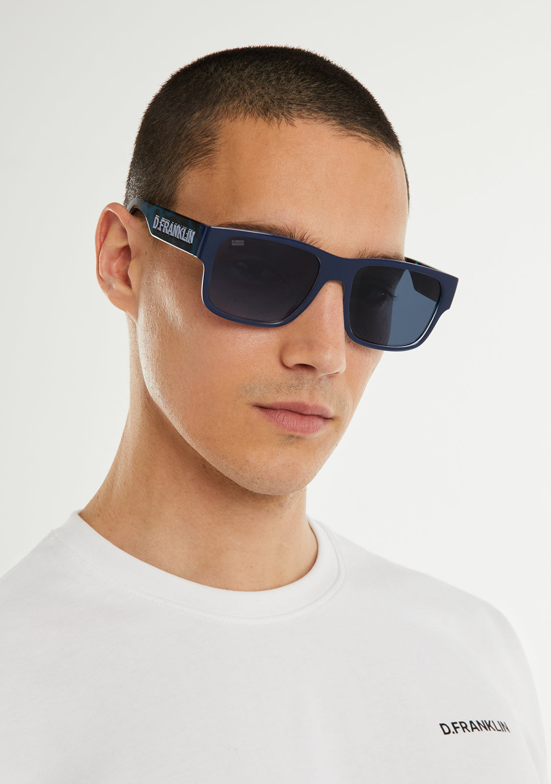 D.Franklin California sunglasses. A model designed in blue tones and vibrant details. Created with our signature D.Franklin details: logo engraved on both temples and emblem on the right lens. The lens width is 57 mm and the front lens width is 148 mm. Side temples are 145 mm long.