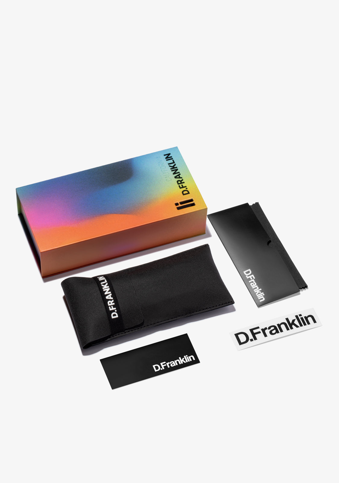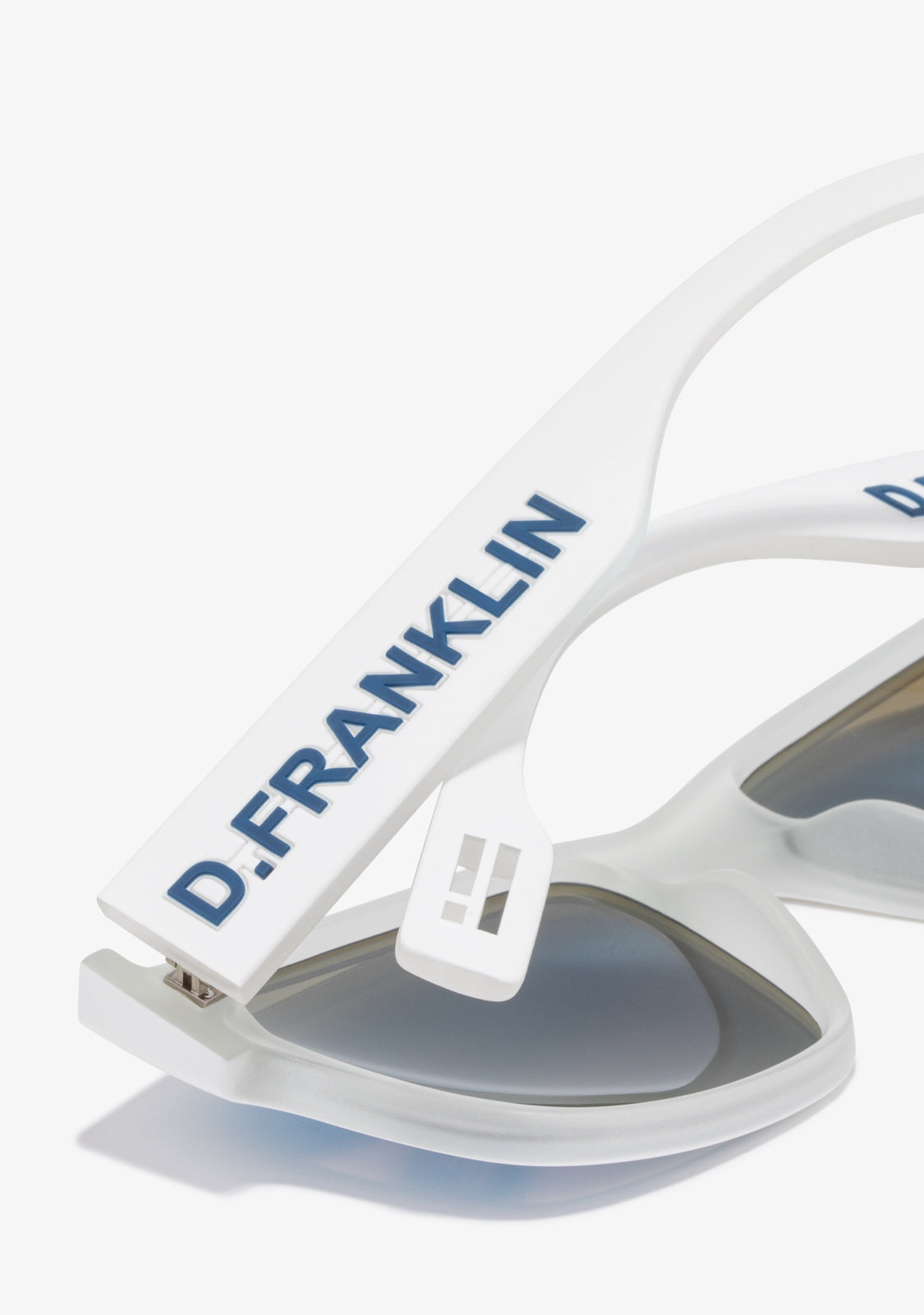 D.Franklin California sunglasses. A model designed in white tones and vibrant details. Created with our signature D.Franklin details: logo engraved on both temples and emblem on the right lens. The lens width is 57 mm and the front lens width is 148 mm. Side temples are 145 mm long.