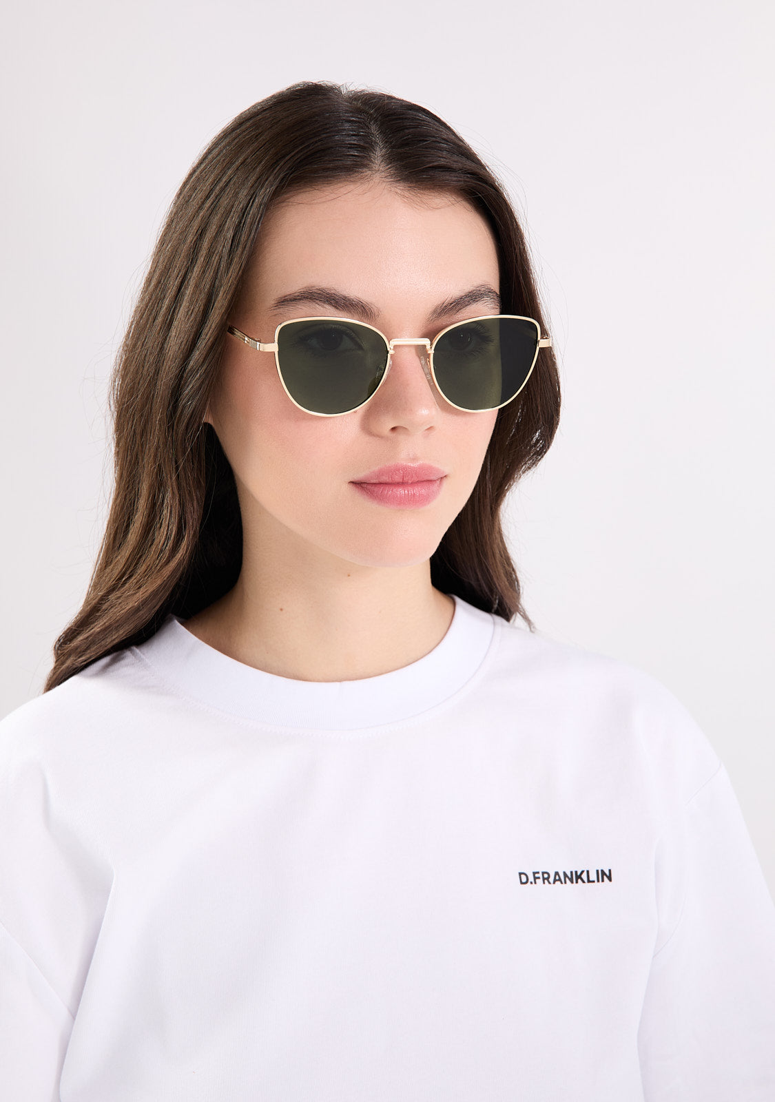 The Cat-Eye Legacy design features a metallic finish with a vintage aesthetic. Its gold-tone frame is paired with G15 green anti-reflective lenses that allow a subtle view through and define the facial features. The front measures 139 mm, and the lens width is 53 mm. The temples are 140 mm long and incorporate our distinctive detailing. A retro yet minimalist piece to frame any outfit.