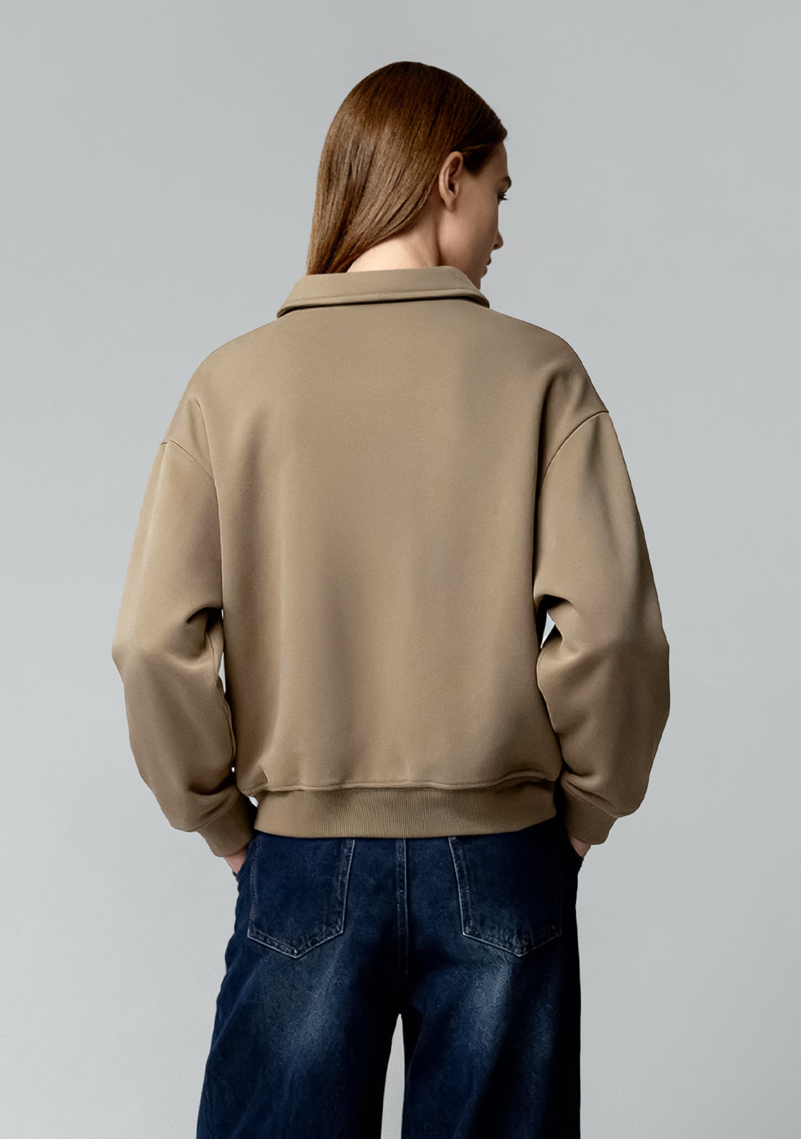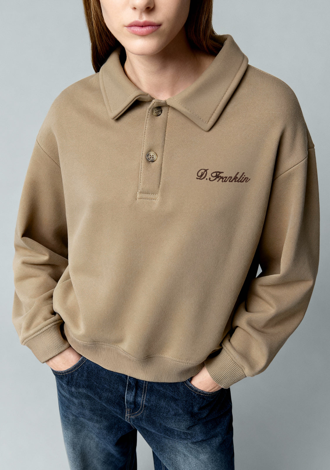 Cropped Polo Sweatshirt Sand is a women's sweatshirt that reimagines a classic cut with a modern twist. The cropped length and polo collar make it a standout piece that’s easy to dress up or down.