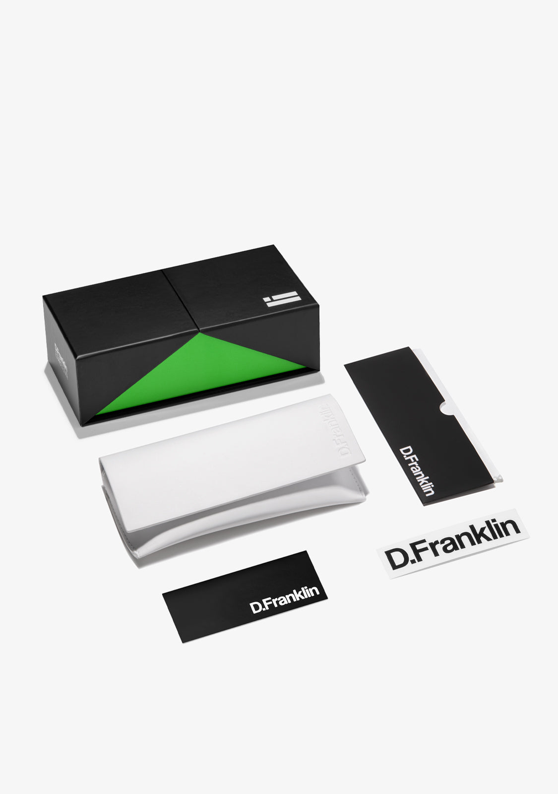 Brown polarized lenses and white frames highlight the uniqueness of this design. It features our distinctive D.Franklin flag with a metallic gold finish on both temples. The 52mm lens width and 139mm front frame are joined by an asymmetrical 140mm temple.