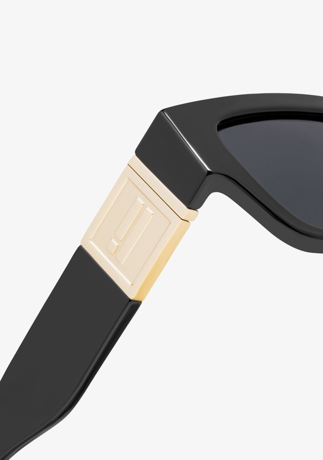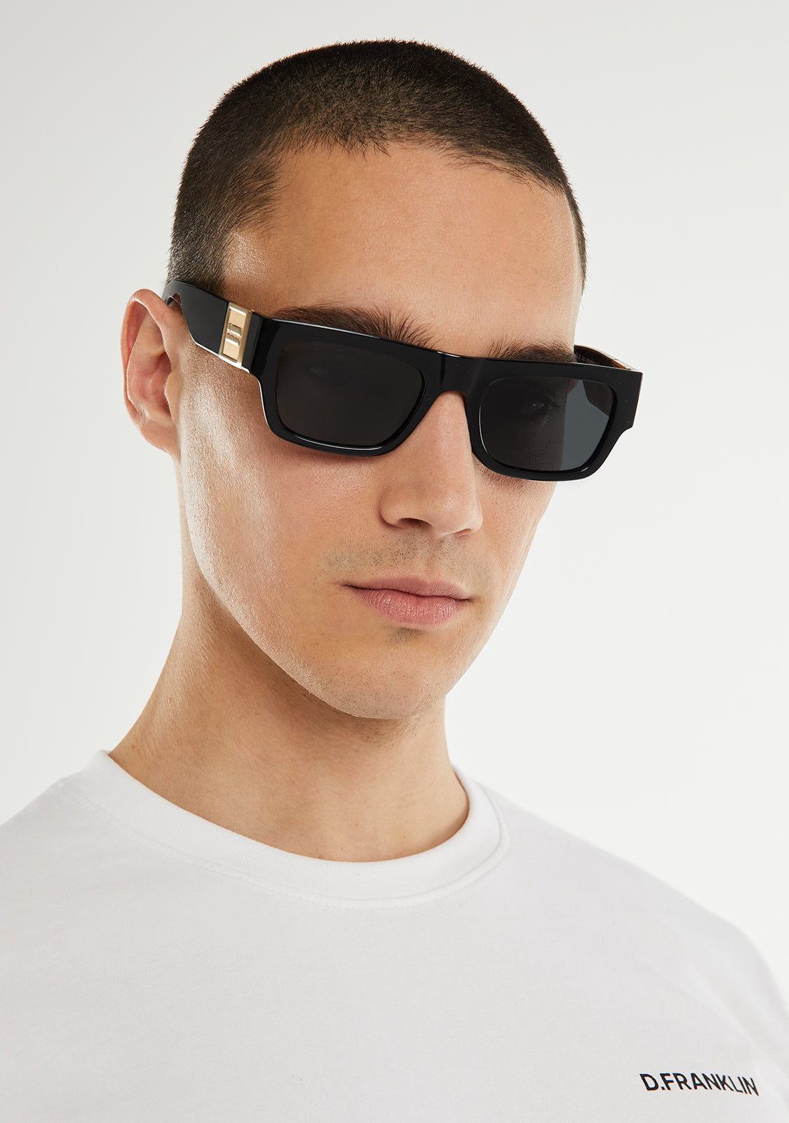 Smoked polarized lenses and dark frames enhance the aesthetics of this design. It features our signature D.Franklin flag with a metallic gold finish on both temples. With a lens width of 52mm and a 141mm front frame, these glasses will flatter most faces. The side temples have a length of 140 mm.