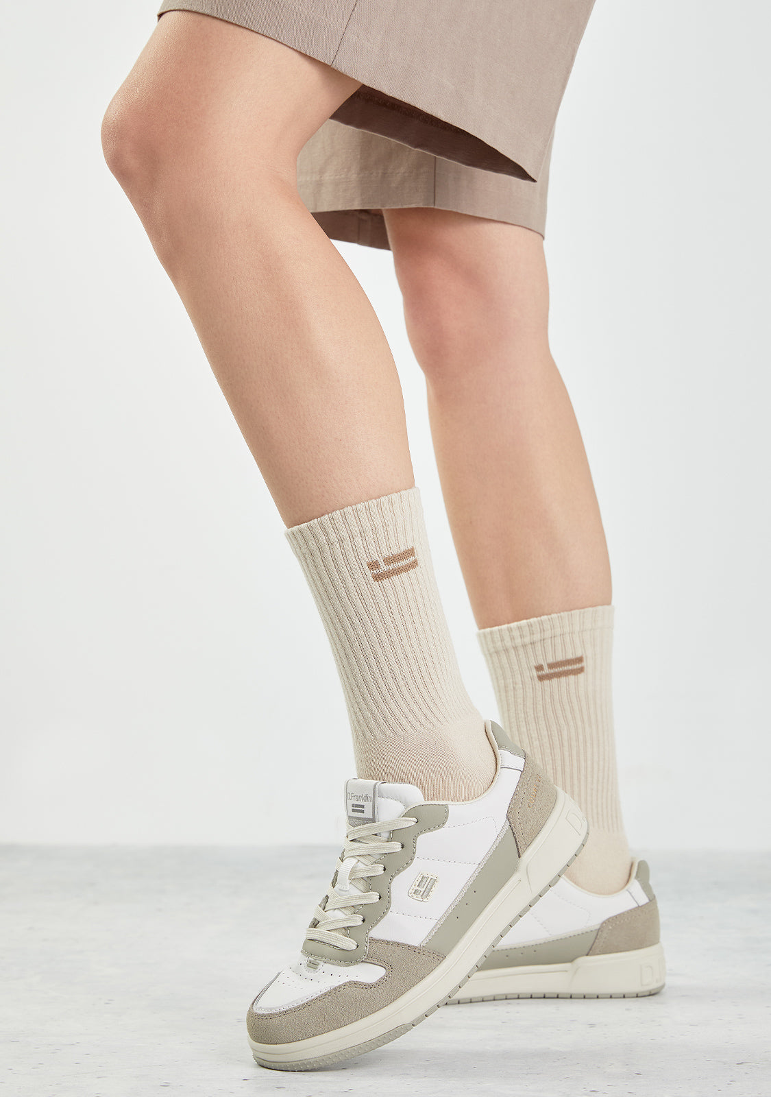 Crafted from a blend of elastic materials and cotton. This beige-finished design features our matching emblem on the sole and a flag on the side. The upper part has a ribbed fabric that ensures a comfortable and flexible fit.