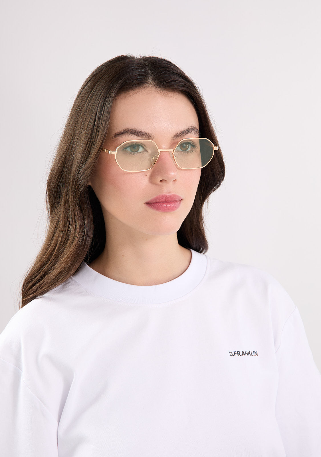 Translucent sunglasses with a geometric design. The legacy of the most iconic pieces from the 70s is combined with a selection of modern details.