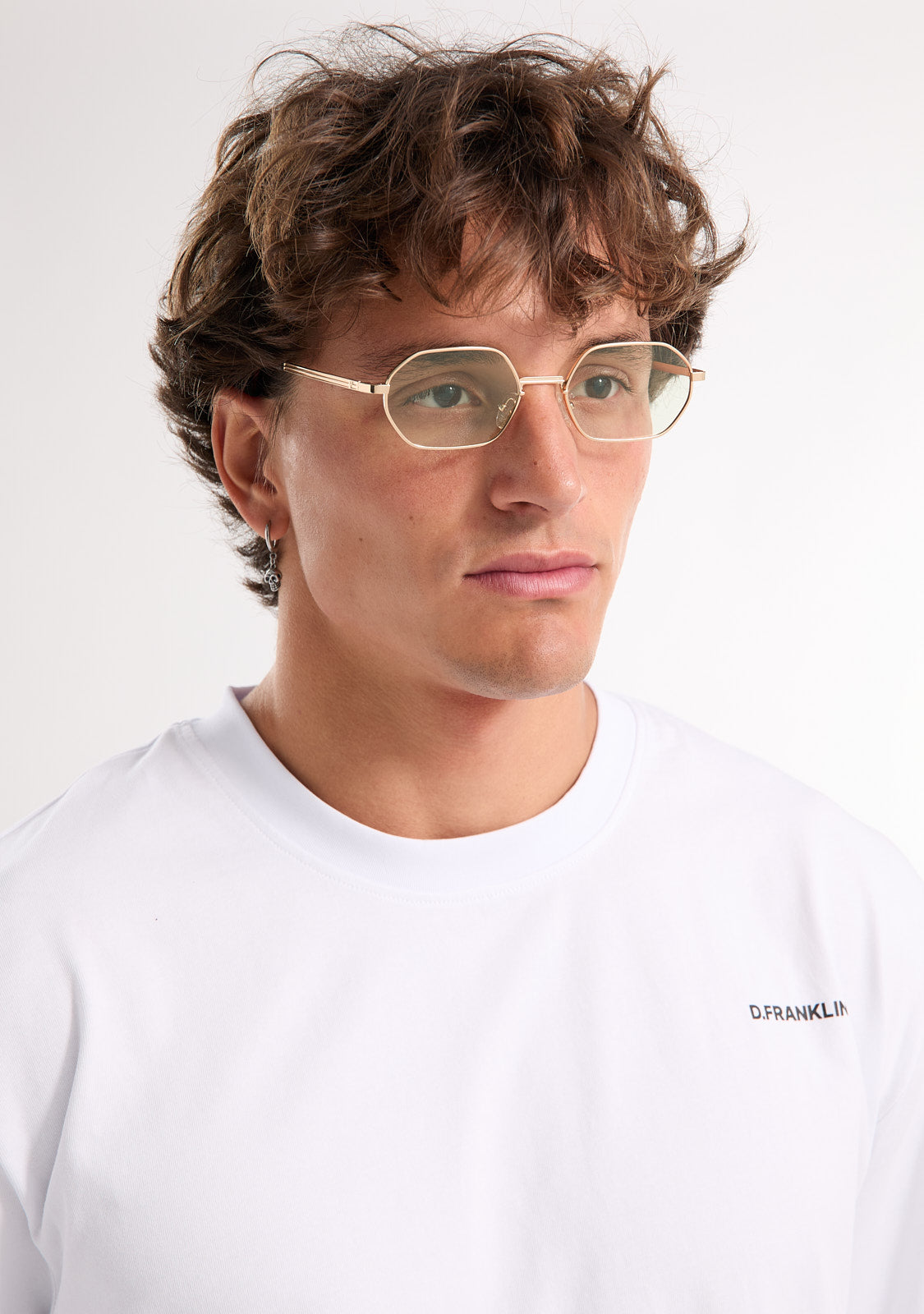 The Square Legacy design features a metallic finish with a hexagonal aesthetic. Its gold-tone frame is paired with brown anti-reflective photochromic lenses that allow a subtle view through and define the facial features. The front measures 141 mm, and the lens width is 54 mm. The temples are 140 mm long and incorporate our distinctive detailing. A retro yet minimalist piece to frame any outfit.