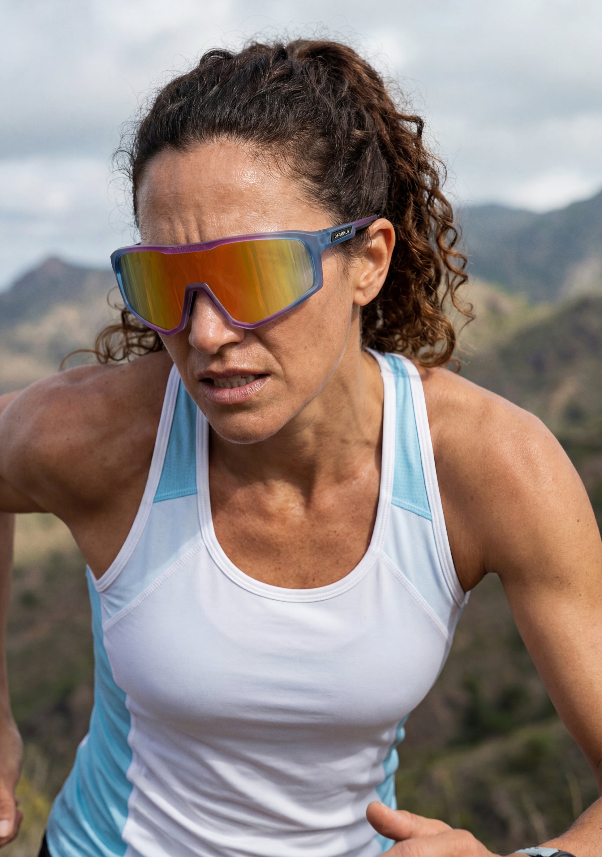 The Hurricane Grad Purple / Pink model stands out for its striking dual-tone finish and aerodynamic frame. It features a 142 mm front and 155 mm lenses, precisely designed to optimize airflow and reduce wind resistance. The 140 mm temples display our emblem on both sides, while silicone pads on the tips and nose bridge ensure a secure and comfortable fit.