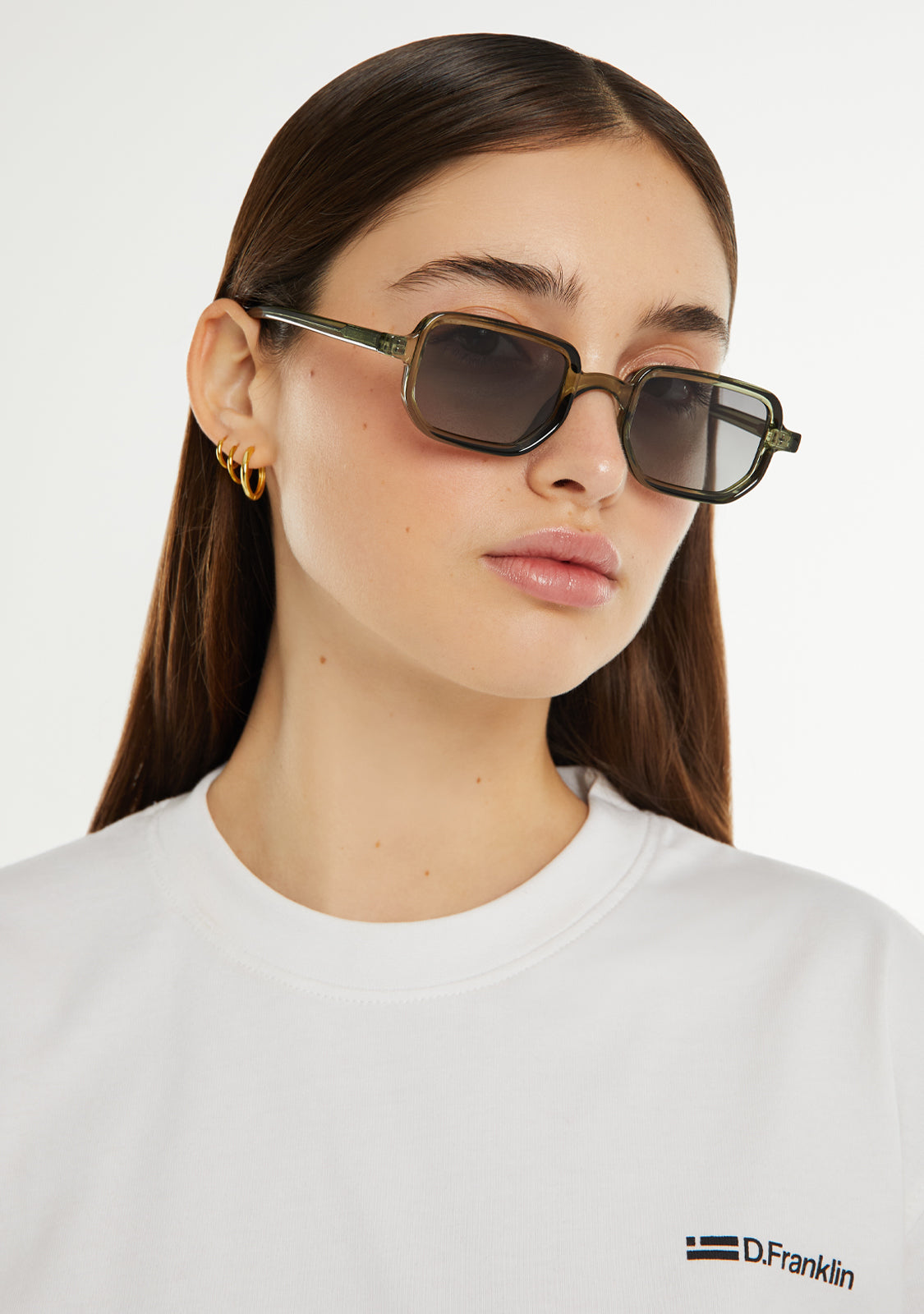 Check out our Jiggy model in green. This retro-inspired silhouette features signature D.Franklin details: the logo engraved on the temples and emblem on the lens. The lens width is 47 mm and the front is 143 mm. The side temples have a length of 145 mm.