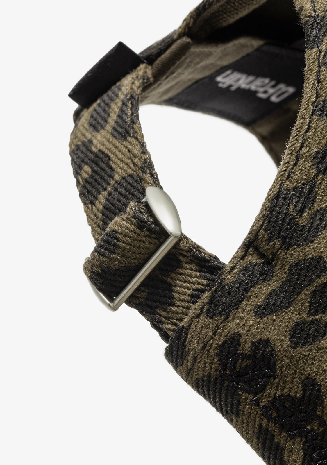 The chenille patch on the visor with a leopard design adds a unique style. The metal piece at the back allows for an adjustable fit, while the inside woven label adds a final touch of distinction.