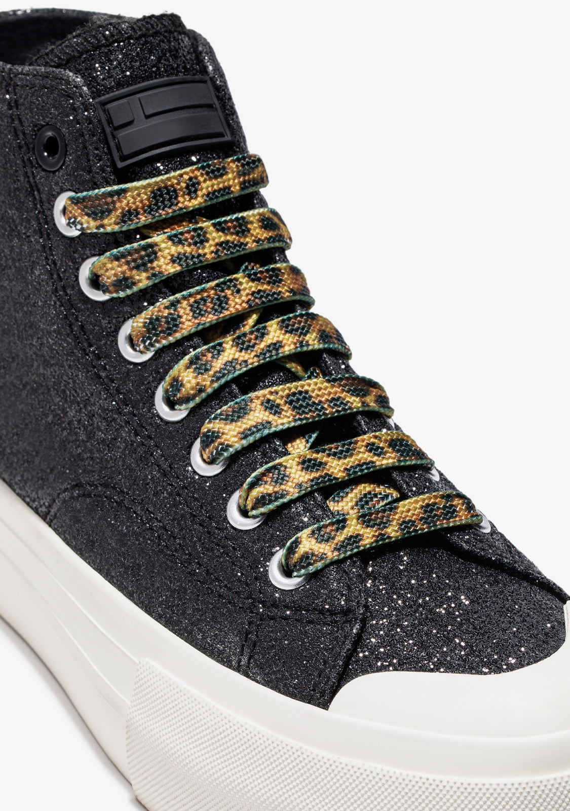 This model is designed with a leopard animal print in ochre and brown tones. It features matching plastic aglets at the ends that allow a perfect fit and prevent the laces from wearing out or fraying easily.