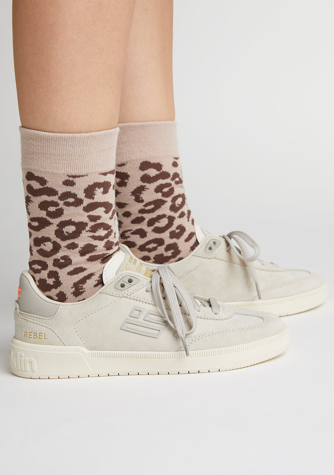 The Leopard Socks Sand by D.Franklin combine a leopard design with a soft sand tone, adding a modern and elegant touch to any outfit. These high calf length socks are designed to provide comfort and a comfortable fit throughout the day.