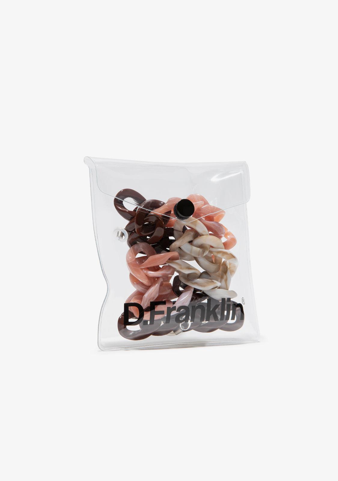 D.Franklin eyewear chain with link aesthetics. An accessory to hang the style of your look. Or to connect with your uncommon side.Link your essence with this design in shades of brown and pink. Its rectangular pieces connect together to form a size-adjustable strap. It also features our metallic emblem at one end.