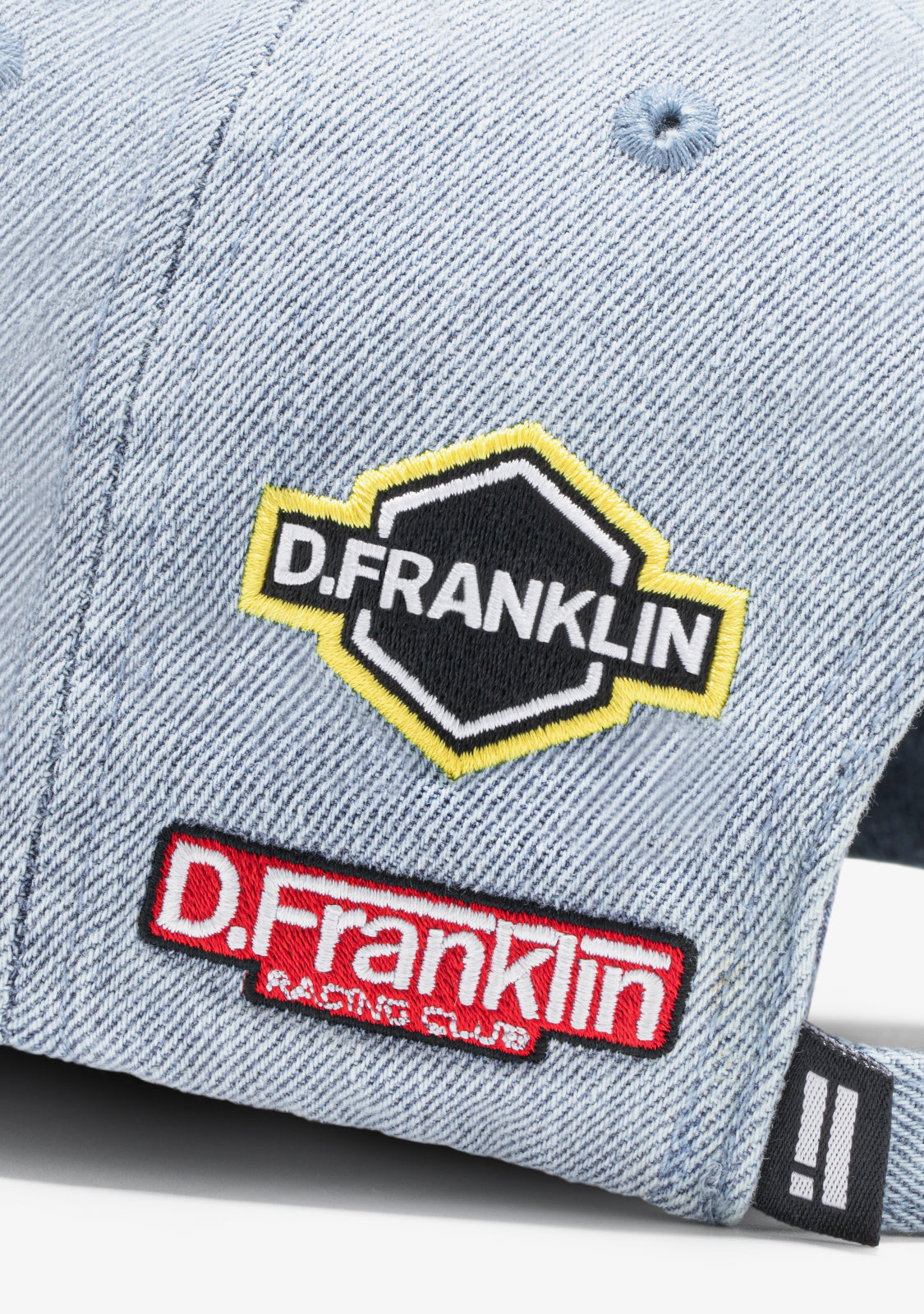 Cap designed in blue denim-effect cotton fabric. It features a D.Franklin emblem on the front in white contrast. It also has an adjustable snapback strap system with a metal buckle on the back.