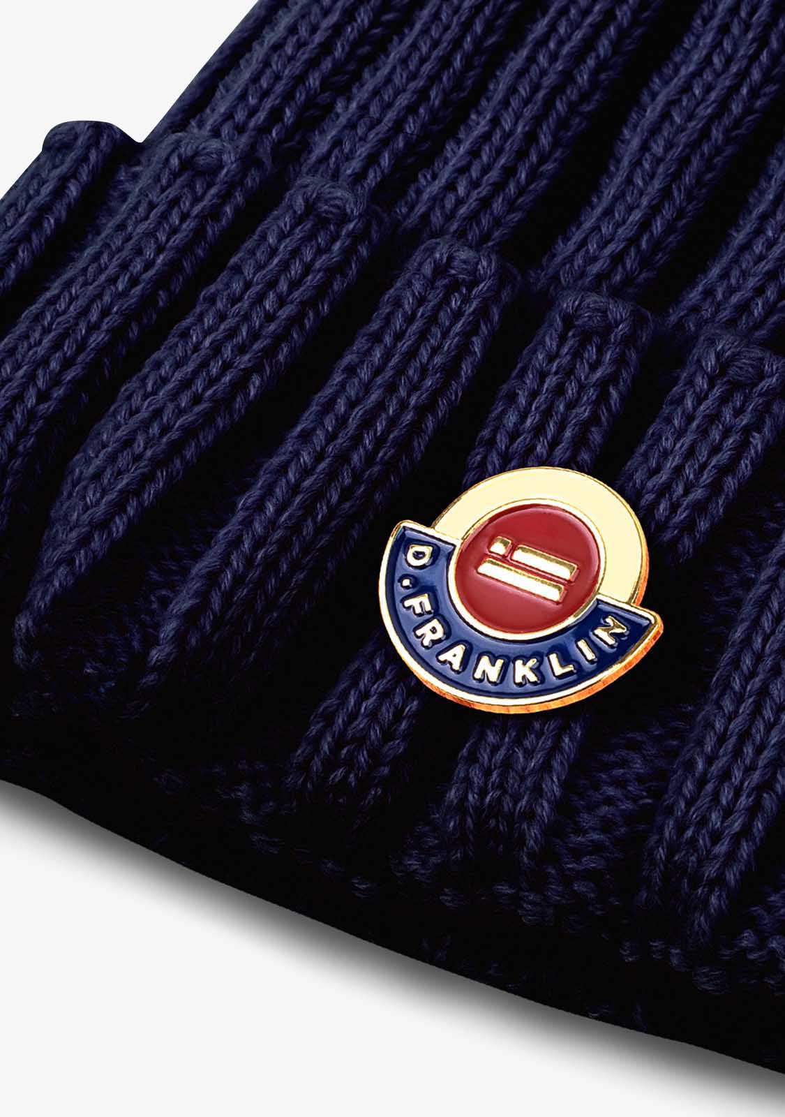 The new Pom Beanies from D.Franklin® are inspired by the popular Nordic beanies. The Pom Beanie Navy combines hand-sewn textures in a double-fold hat in navy color with an elastic knit and logo pin detail on the front.