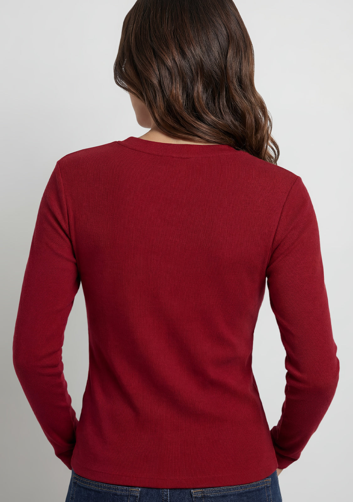 The Rib Long Sleeve Top Burgundy by D.Franklin is a long-sleeve top that stands out for its modern and elegant design. Made with 94% cotton and 6% spandex, and a 280 gsm weight, this garment is soft and light, perfect for maintaining comfort throughout the day.
