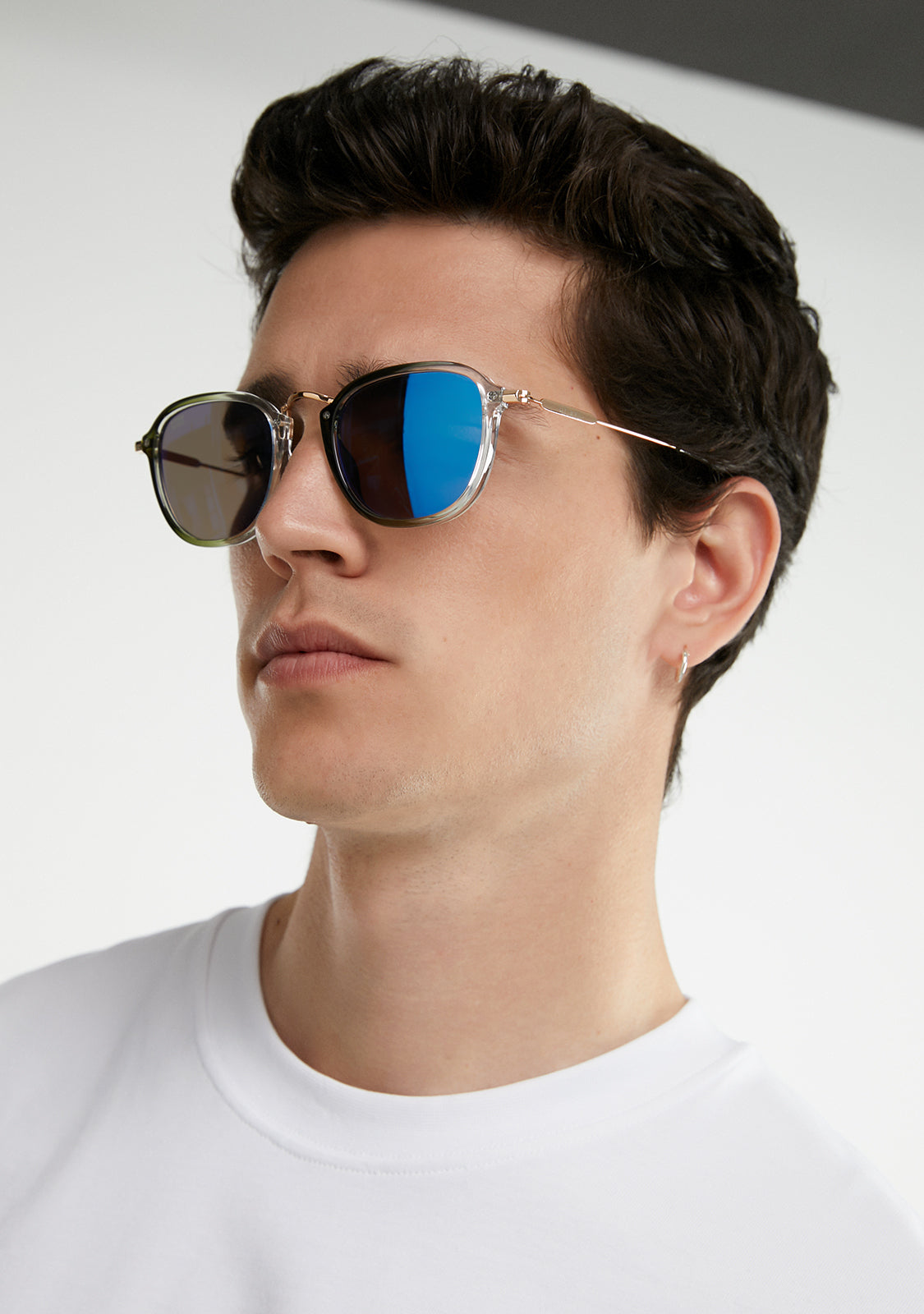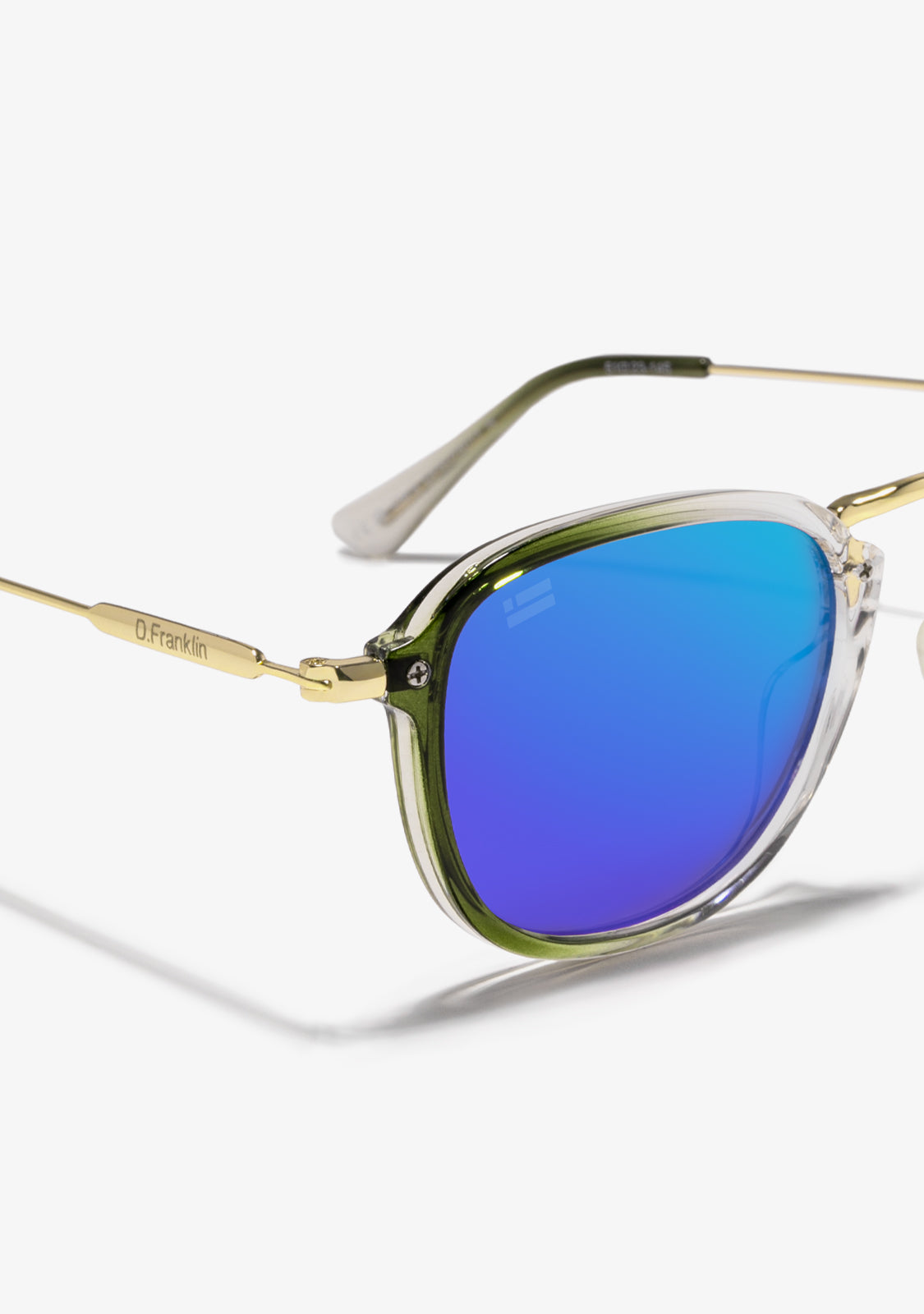 The spirit of the sixties. We travel back in time and modernise one of D.Franklin most iconic models. These retro-inspired sunglasses fuse a classic frame style with a clean, trendy finish. Unisex design with vintage essence, created for an unmistakable aesthetic.Mirrored polycarbonate revo lenses feature a smoky green hue on a square-framed gold silhouette. It features our brand's signature details: the logo engraved on both metal temples and our emblem on the right lens. With a 51mm lens width and 147mm front frame, these glasses enhance any face. The side temples are made of stainless steel and have a length of 145mm.