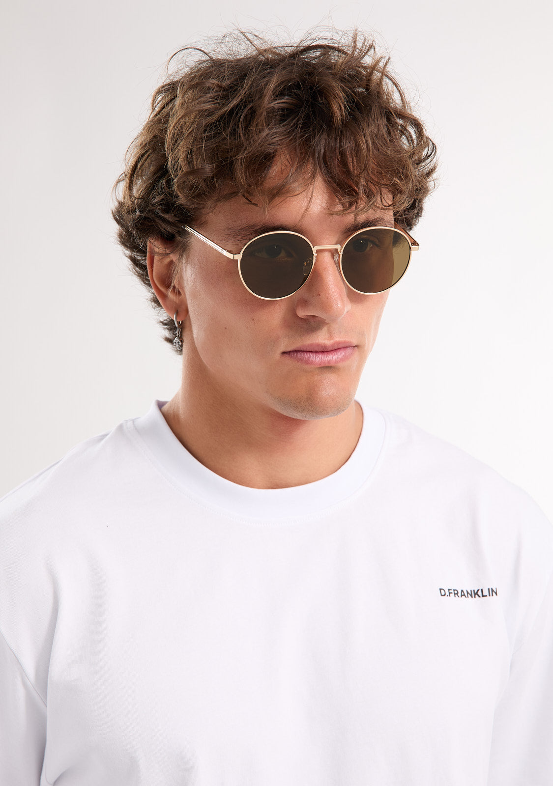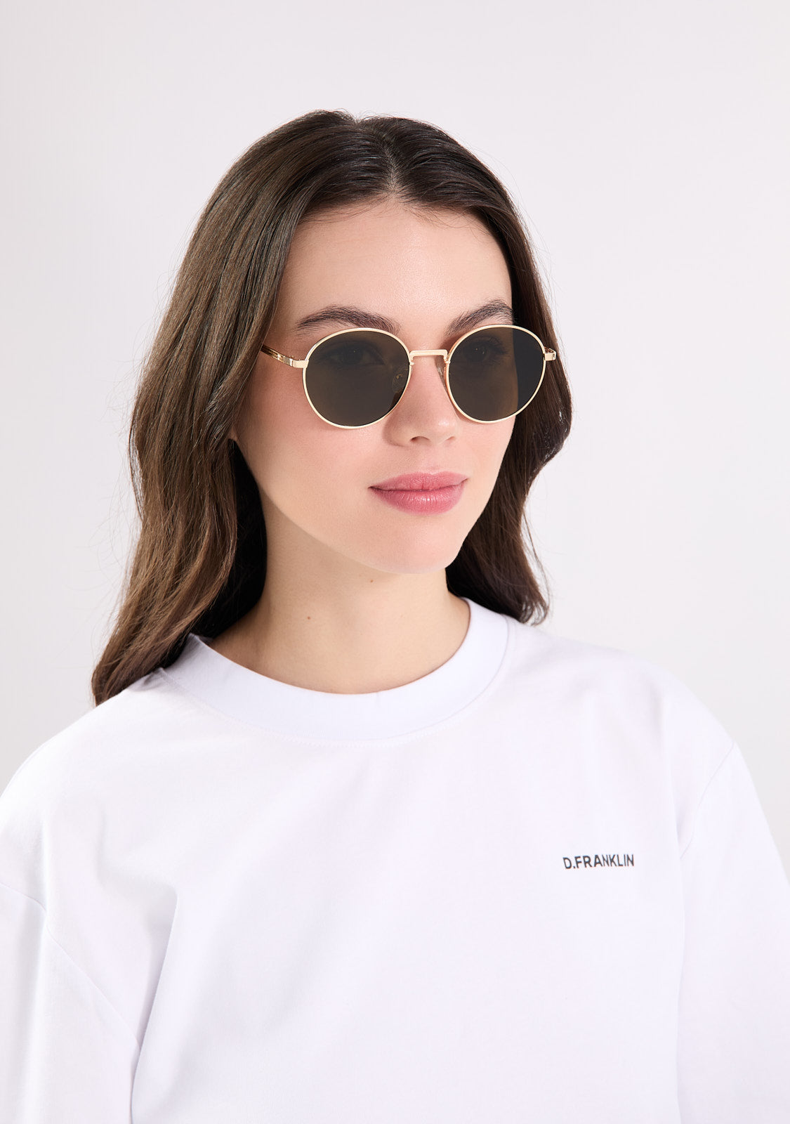 The Round Legacy design features a metallic finish with an oval aesthetic. Its gold-tone frame is paired with dark brown anti-reflective lenses that allow a subtle view through and define the facial features. The front measures 139 mm, and the lens width is 52 mm. The temples are 140 mm long and incorporate our distinctive detailing. A retro yet minimalist piece to frame any outfit.