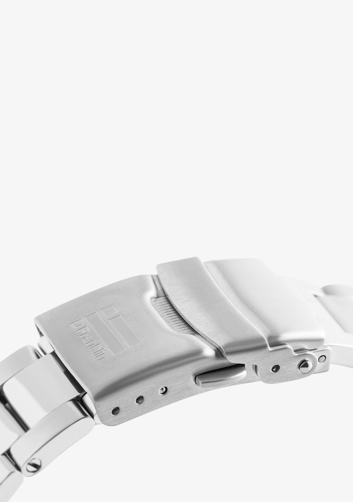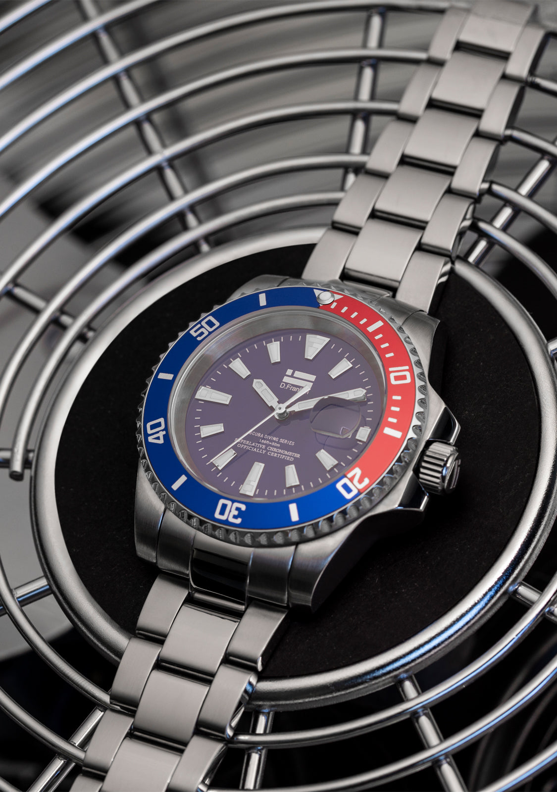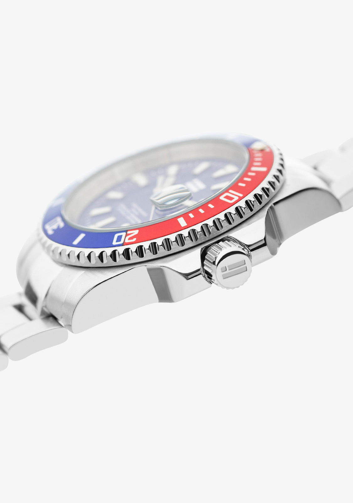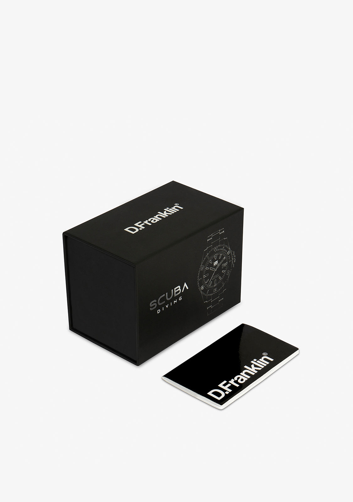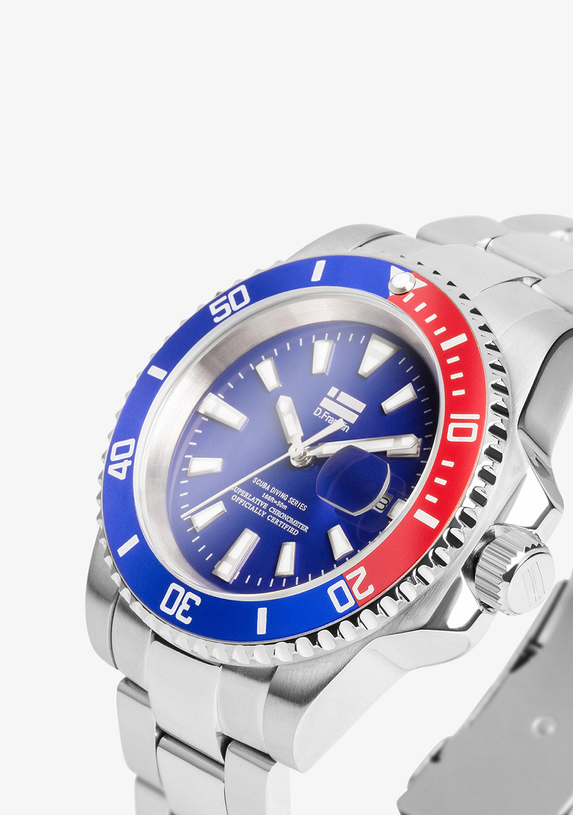 The Scuba Diving models are part of the new D.Franklin® men's watch collection. A limited edition for them, featuring a 3-hand mechanism, a three-link stainless steel strap and a sapphire-coated dial. The Scuba Diving Steel Blue Red / Blue is an example of elegance. Silver finish, with a deep blue dial and red detail on the side.