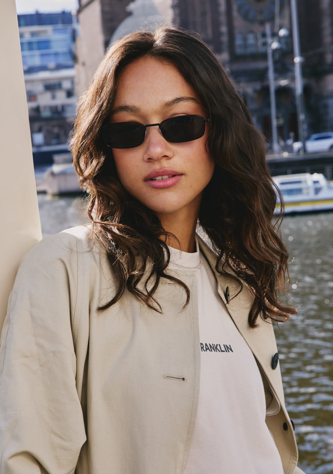 The Square Legacy design features a metallic finish with a rectangular aesthetic. Its black-tone frame is paired with smoke-effect, anti-reflective lenses that allow a subtle view through and define the facial features. The front measures 142 mm, and the lens width is 56 mm. The temples are 140 mm long and incorporate our distinctive detailing. A retro yet minimalist piece to frame any outfit.