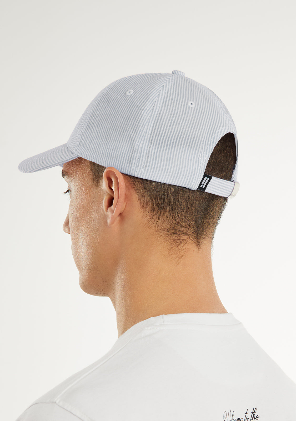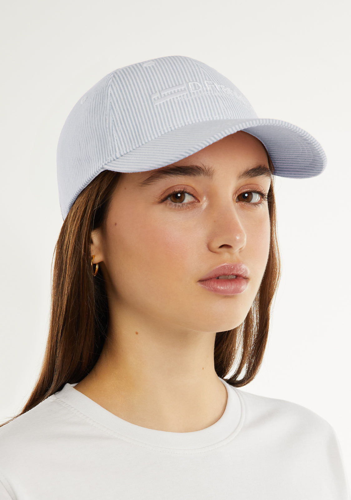 D.Franklin blue and white striped cap with stitching detail in the same color. Inspired by the Old Money trend.