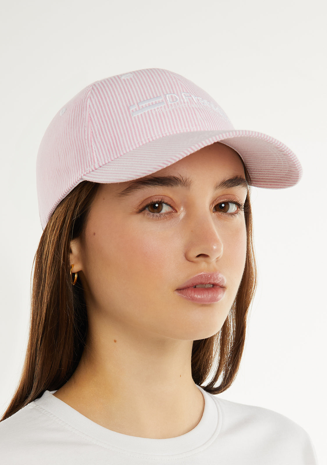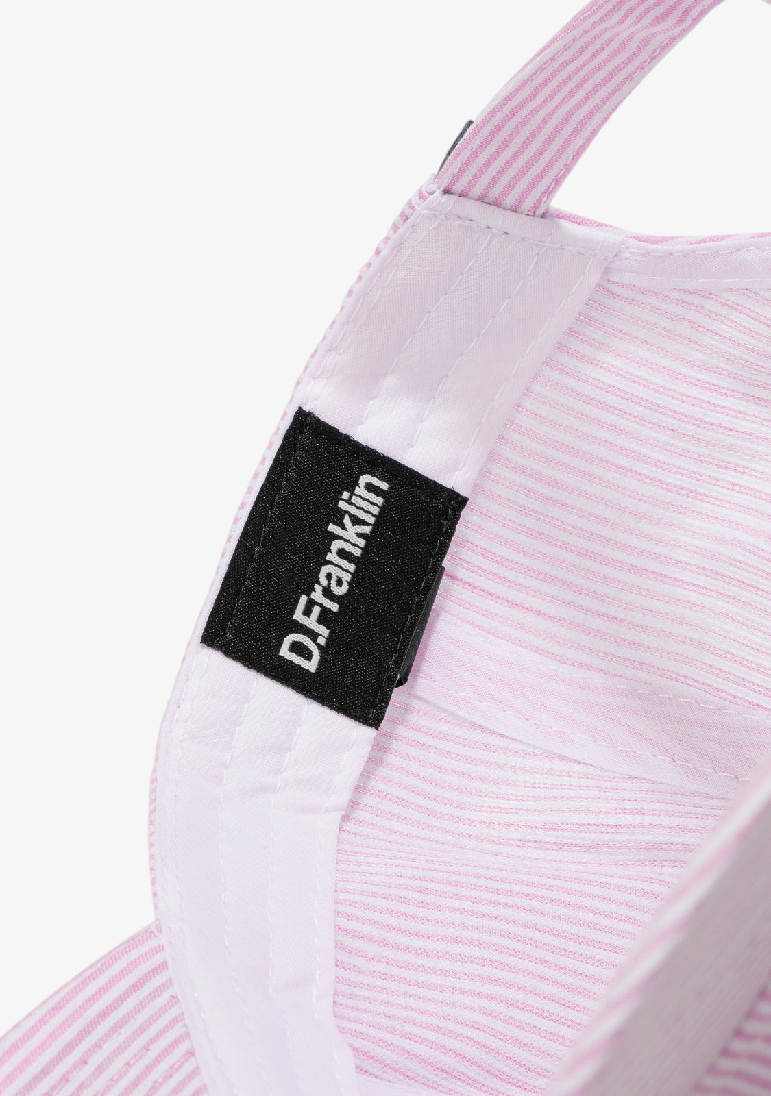 D.Franklin pink and white striped cap with stitching detail in the same color. Inspired by the Old Money trend.