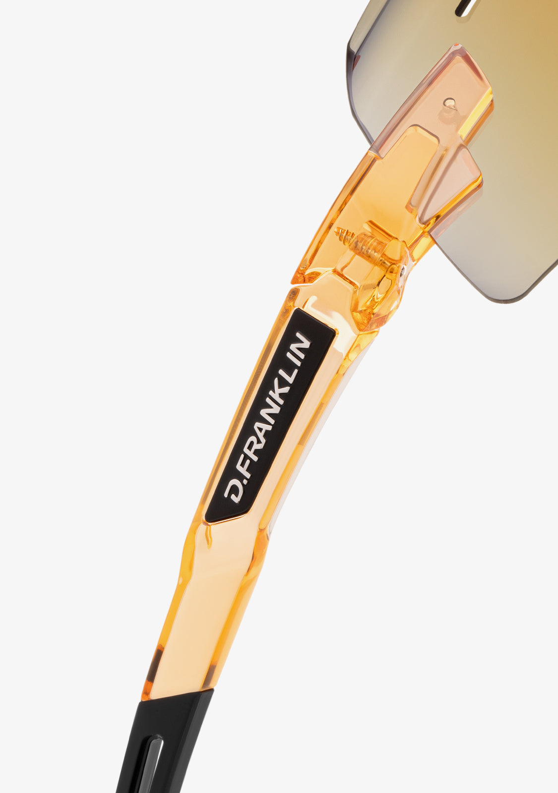 - Smoke-Gold Revo polycarbonate lenses: sharp visibility with sporty aesthetics