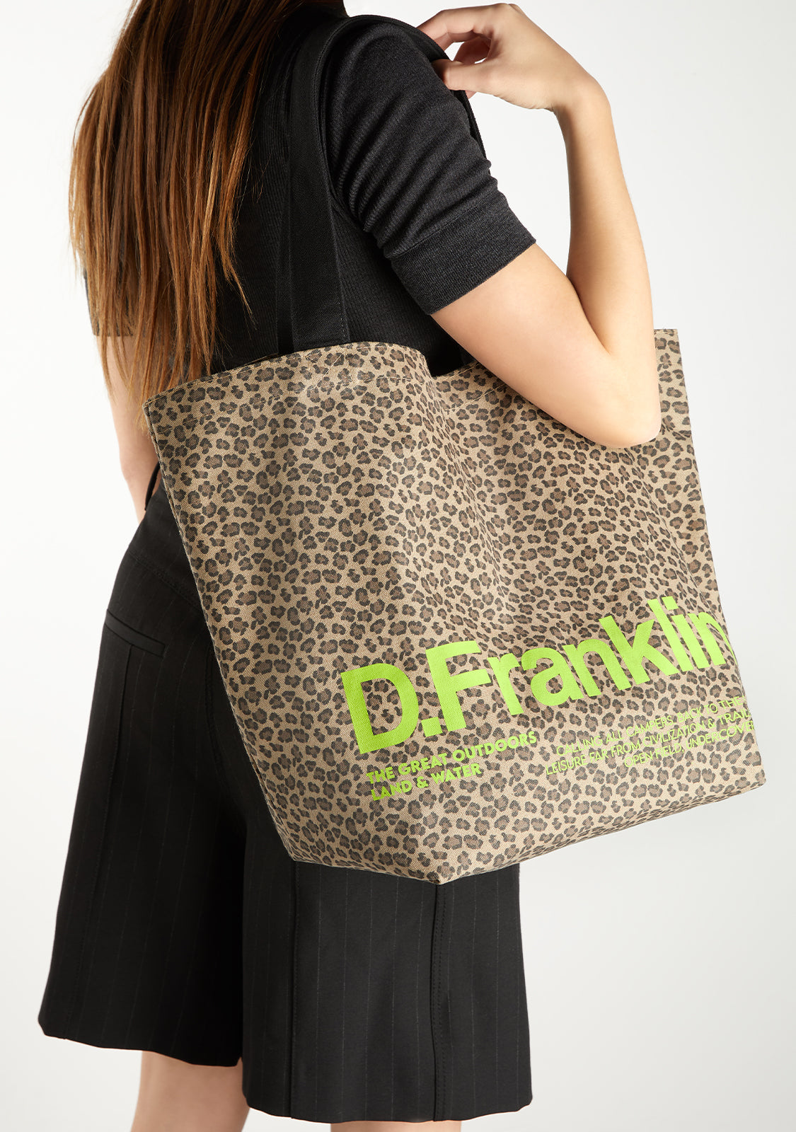 Designed in leopard print, with the D.Franklin logo in lime green.