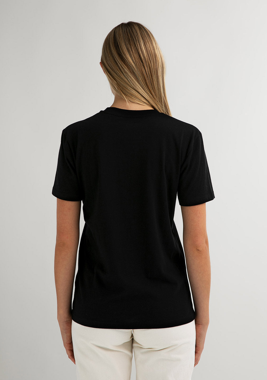 Black short sleeve T-shirt with white D.Franklin logo outline. Front with inspiration from American colleges and fraternities. Round neck with double stitching. Made from 100% organic cotton. Female model.