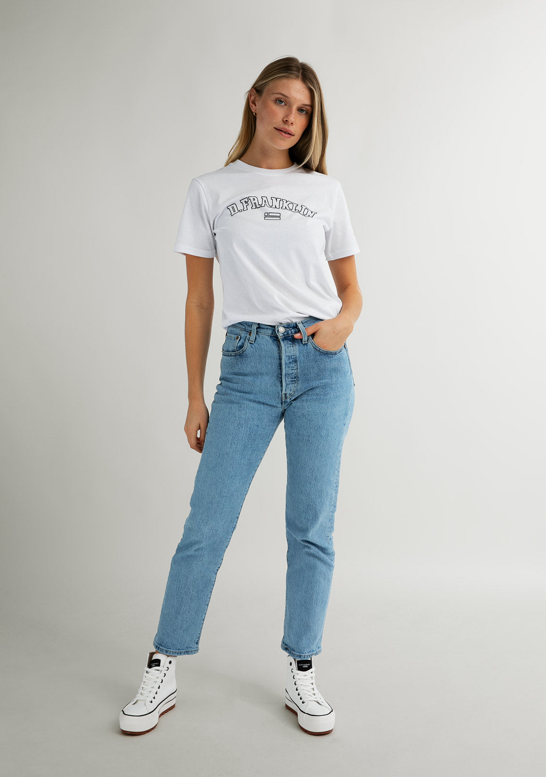 White short sleeve T-shirt with black D.Franklin logo outline. Front with inspiration from American colleges and fraternities. Round neck with double stitching. Made from 100% organic cotton. Feminine model.